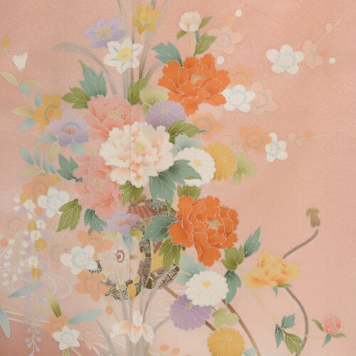 ◆ 【2020年】 ご予約可能です【色留袖レンタル サモンピンク水に花車】 写真(上)前アップ(下)後ろアップ ※商品の色については画面を表示するモニターによって実際と多少異なる場合がございます。