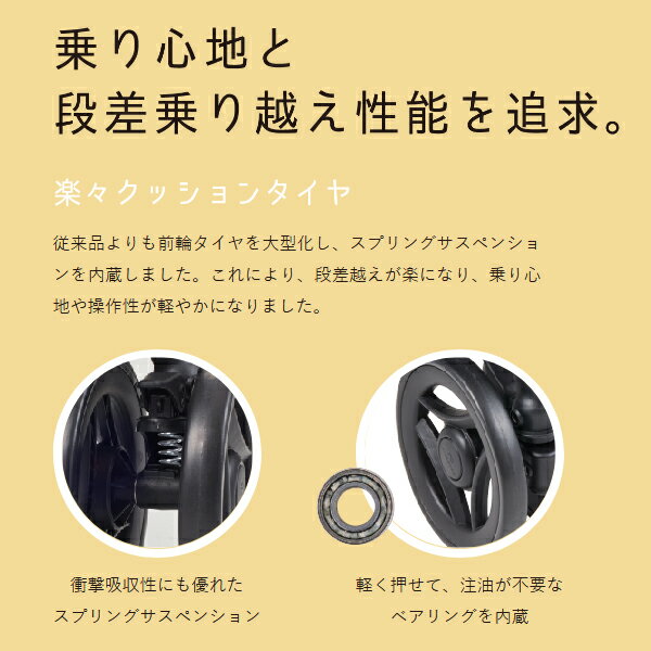従来品よりも前輪タイヤを大型化し、スプリングサスペンションを内蔵しました。