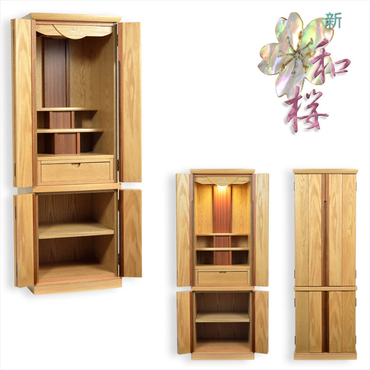 (一部MDF使用) 軽くて丈夫なお仏壇に仕上げました 豪華な銘木を使った【新・和桜43号】新登場! 風に乗って華やかに舞う桜の花びらをイメージした 天然アコヤ貝使用の螺鈿(らでん)細工 光の当たり方で虹色に煌めく、上品で高級感漂うモダンな装飾 豪華な天然木オーク材に、サペリ材をアクセントにした オシャレなツートンコンビ シンプルでありながら、現代的なシャープな印象と 都会的なモダンな印象を合わせ持つ 洋室・リビングにピッタリのお仏壇です 本格的な三段仕様 段ごとに高さがあるので 大きめの本尊・位牌もお祀り可能 下台には、棚板一枚付属 大きな収納スペースは重宝します 棚板を外せば、骨壷の仮置きも可能 スライドトレー、引き出し装備、電源コード コスパに優れた安心価格 省エネ型高輝度LEDダウンライト搭載 暗いお部屋や夜間でも安心してお参りできます 万が一の時でも安心:電球タイプに比べLEDは球切れし難いものですが 切れないわけではありません 球切れした時もお客様ご自身で交換可能な「ユニット構造」です LEDユニットを回して外すだけ、面倒な配線もありません 他社のように、仏壇ごと修理にだす必要はありません LED取り替えユニットは安価(有料)にてお譲り致します 【仏具一式付き仏壇】 ■お仏壇は高級感溢れる銘木2種類をご用意 仏具はお仏壇に合わせた色を組み合わせています ・仏壇オーク材/サペリ材コンビ+仏具一式付きはコチラ ・仏壇ウォールナット材/ブナ材コンビ+仏具一式付きはコチラ 【お仏壇単品売り】 ・仏壇オーク材/サペリ材コンビはコチラ ・仏壇ウォールナット材/ブナ材コンビはコチラ ■原産国:海外 日本企画 ■サイズ:43号 外寸 幅44cm×総高130cm×奥40cm 上段 奥11.2cm(有効)×ダウンライトまで高34.5cm 中段 奥8.8cm(有効)×高49cm 下段 奥13.7cm(有効)×高61.5cm 折り戸の全開幅65cm 内幅 38cm 下台 内奥35.5cm×高40cm ※手造りの為、サイズには多少の個体差がございます 重量:約31kg ■材質 本体:芯材 桐材無垢(一部木質繊維板使用) 表面材 天然木オーク薄板貼 ツートンコンビ・サペリ材 桜装飾:天然アコヤ貝 ※掲載写真の仏具、位牌、本尊などは別売です ※入荷ロットにより、多少色味に差異がございます ■送料無料(但し離島は別送料かかります) 【お仏壇メモ】下記は弊社商品での目安です 仏像:座像2.5寸 立像:4.0寸 掛軸:京都西陣織タイプ、格安掛軸(新金掛軸)共に30代 ※掛軸掛け金具がついておりませんので掛軸台か掛軸留めが必要です ・掛軸の場合は、置き軸型の「ティアラ」や「クレア」がオススメ 位牌:4.5寸〜5.0オススメ 仏具:3.0寸オススメ ◆仏壇の電装パーツ(LEDライト・電球ライト)の保証は 商品発送日から3ヶ月間です ・重要:必ずお読みください【電装パーツの保証規定】
